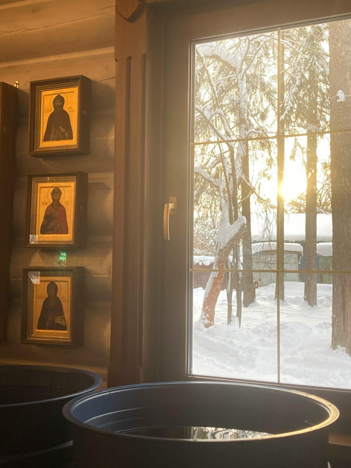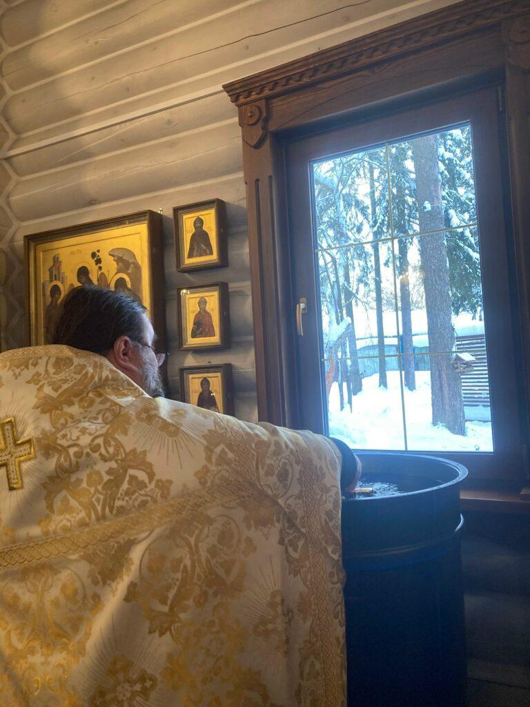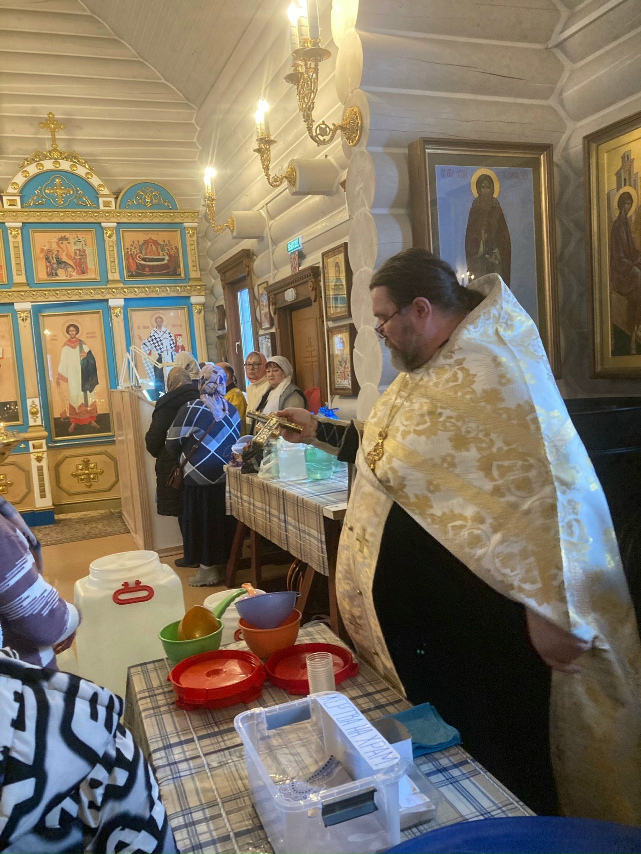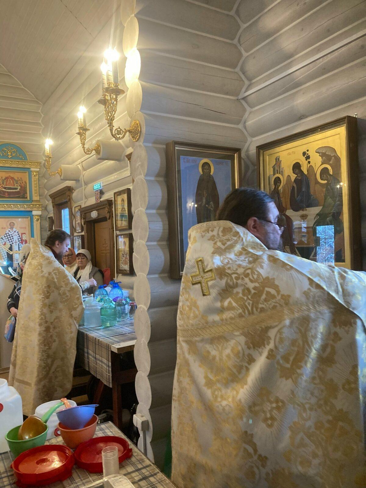 Великое освящение воды.Разрушил еси Крестом Твоим смерть, отверзл еси разбойнику рай, мироносицам плач преложил еси, и апостолом проповедати повелел еси, яко воскресл еси, Христе Боже, даруяй мирови велию милость.
