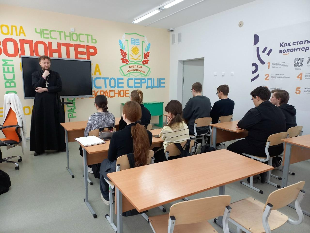 В школе п. Краснооктябрьский о. Алексей провел уроки в 8 и 10 классах на тему «Добро и зло, мой выбор», а Татьяна Александровна в 1 и 3 классах на тему «Православные праздники». В п. Вичевщина уроки были проведены в 6 и 3 классах. На всех уроках шел разговор о самом важном-нашей душе: о работе над собой, о грехах и добродетелях, о православных праздниках и традициях, о жизни святых людей и милости Божьей.