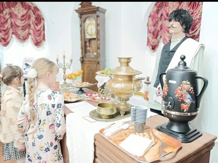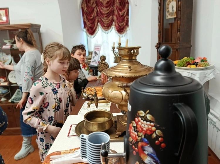 Благодаря замечательному экскурсоводу Дарье Михайловне Коровиной мы узнали о каповом промысле и слепом мастере Амвросии Ковязине, о народном празднике Свистунья, о том, как художник Алексей Деньшин спас старинный вятский промысел – Дымковскую игрушку, о купцах-меценатах и многом другом. Дети с восторгом слушали нежную мелодию музыкальной шкатулки и удивлялись красоте самоваров. Внимание девочек привлекли кулинарные изыски, а мальчиков — фигура мастера изделий из дерева. Взрослые тоже узнали много нового.