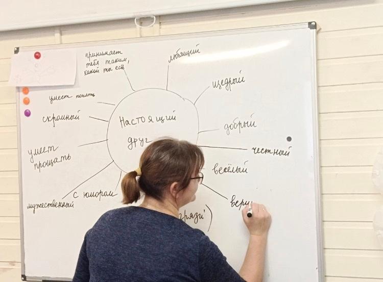 Далее Ирина Сергеевна предложила ребятам написать, какие качества должны быть у друга и какие есть у них. Потом предложенные качества записали на доске, и дети решили воспитывать их в себе.