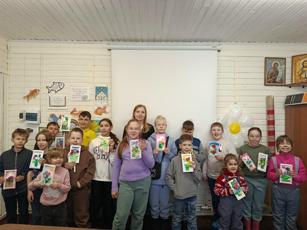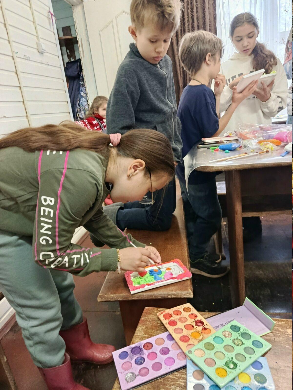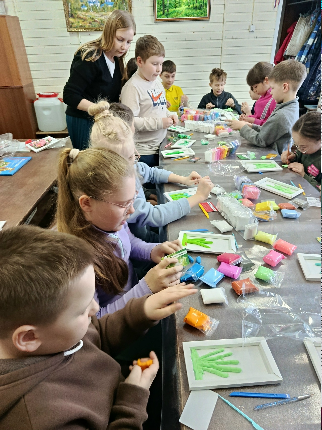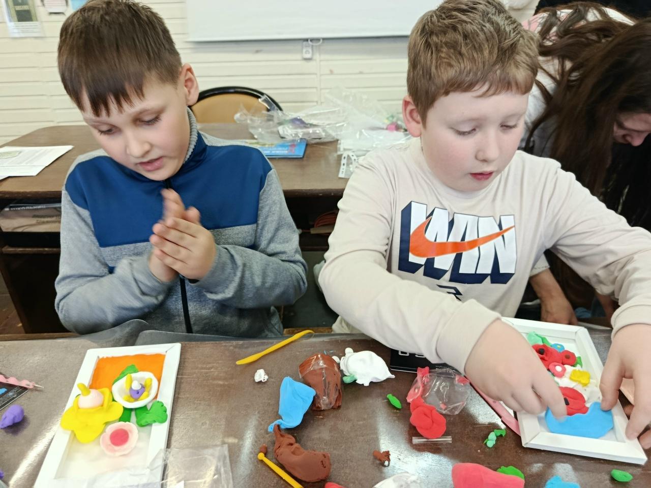 И как всегда, своим умением рукодельничать поделилась Елена Буркова. Перед Пасхой она научила детей мастерить корзинки из жгута. А с прошлого занятия каждый ребёнок принёс домой панно с цветами из воздушного пластилина. Причём, каждая поделка получилась красивой и своеобразной! Благодарим нашу умелицу за предоставленную радость творчества!