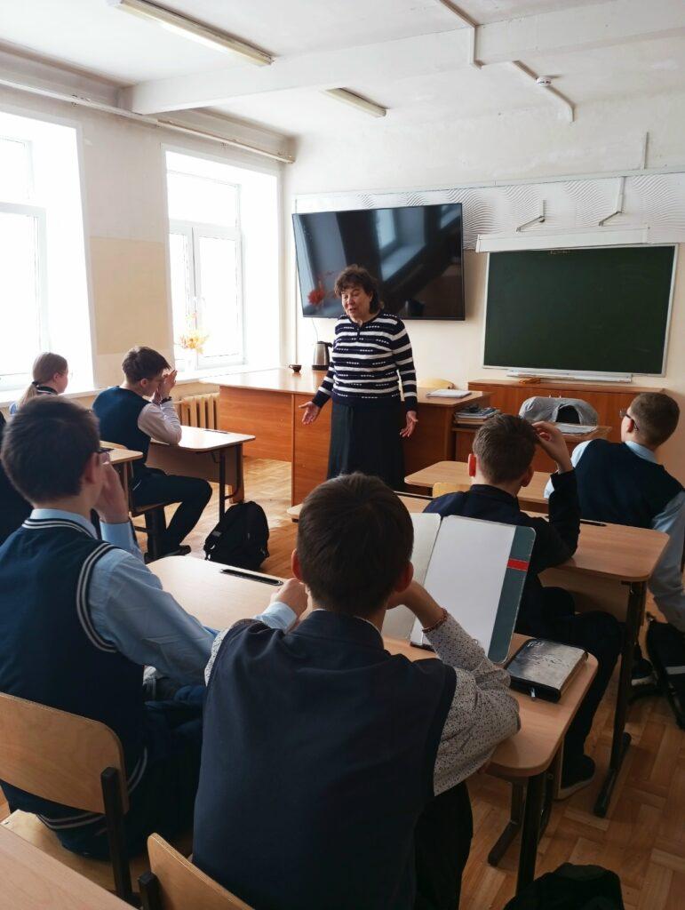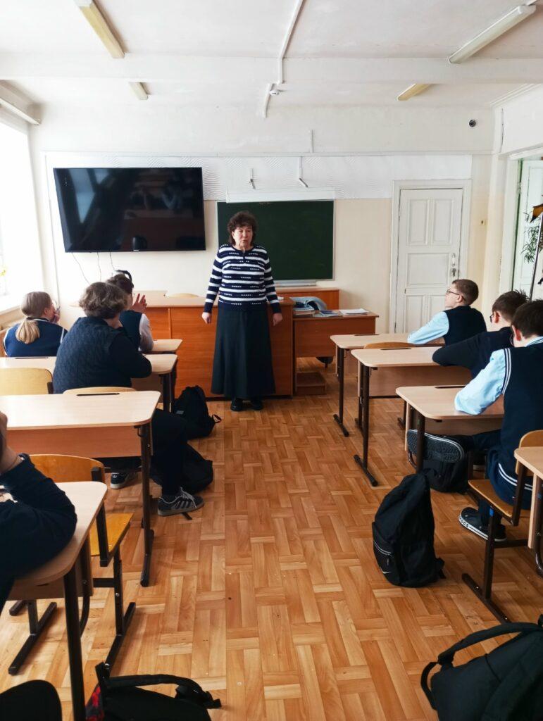 В 8 классе был проведен урок на тему: «Жизнь и подвиг святых-пример для подражания». Татьяна Александровна рассказала о жизни, подвиге и молитве русских святых, живущих во время Великой Отечественной войны. Дети узнали о жизни преподобного Серафима Вырицкого, святителя Луки Войно-Ясенецкого и Блаженной Матроны Московской. На примере жизни святых людей в процессе урока у детей формируется положительное отношение к нравственным поступкам; навыки милосердия, доброжелательности, чуткости; воспитывается добропорядочность, уважение и любовь к Богу, к Родине и ближнему; стремление жить по заповедям. После рассказа о жизни и подвиге святых, весь новый материал обсудили с детьми, учащиеся ответили на вопросы, поговорили о том, что нужно для того, чтобы стать лучше и добрее, как важно выбрать правильный пример для подражания и какие добрые дела можно и нужно сделать в ближайшие выходные.