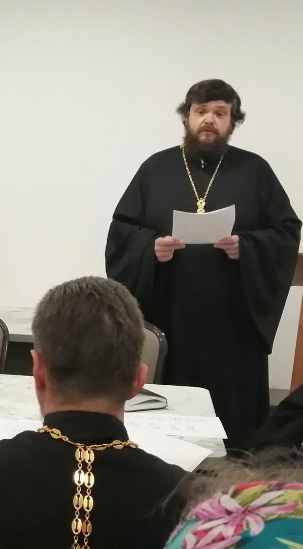 Далее мы прошли в конференц зал и началась работа секции. Иерей и благочинный Вятской епархии Виталий Лапшин огласил повестку дня. Перед этим нам показали слайды о поездке Вятских священников на СВО и о новой иконе Божией Матери «Августовская Победа». Эту икону начали писать в Донецке, а закончили у нас, в Вятке. Сейчас икона находится в храме Рождества Богородицы. Но батюшки постоянно возят икону на СВО.